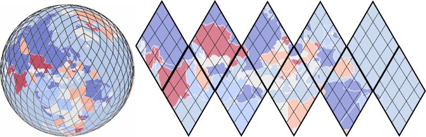 Construction of quality evaluation indicator system for diamond discrete global grid systems(全球菱形离散格网质量评价体系构建研究)研究系统梳理了经典离散格网质量评估标准(Goodchild准则),从空间特征出发,解析几何指标间相关性,重新构建了一套面向非等积、等积球面菱形格网的质量评价体系。