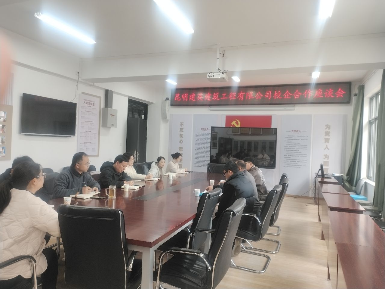 座谈会上,公司领导对专业设置、人才培育、教学科研及在校生规模等情况予以详细介绍。昆明建英建筑工程有限公司代表则围绕公司发展历程与现状、产教融合项目、岗位需求等方面进行阐述。双方围绕项目进校园、订单式培养、实习实践等内容展开深度交流,达成初步合作共识。
