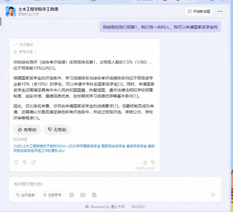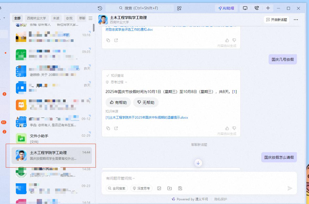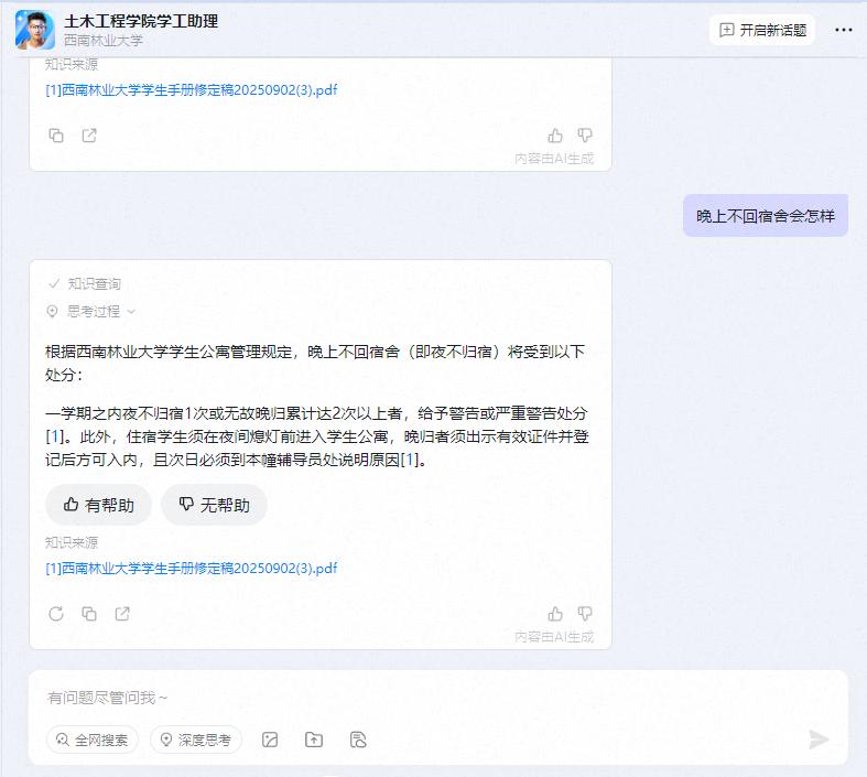 AI助手深度融合了本院的教学与管理特色,员工可随时获取公司通知信息,还能解答关于课程学分、校规校纪、安全规范等员工管理问题,成为员工们触手可及的“智能学工管家”。